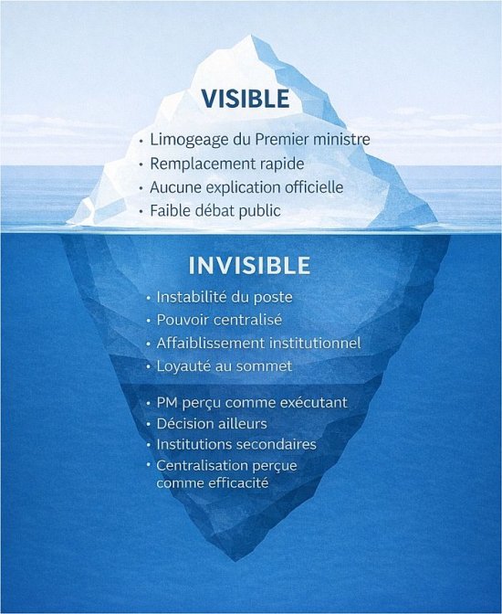 Mais que devient ce rôle lorsqu’il peut être interrompue sans motif explicite, dans un délai aussi court, le Premier ministre pouvant alors être remplacé par une figure sans base politique identifiable ?