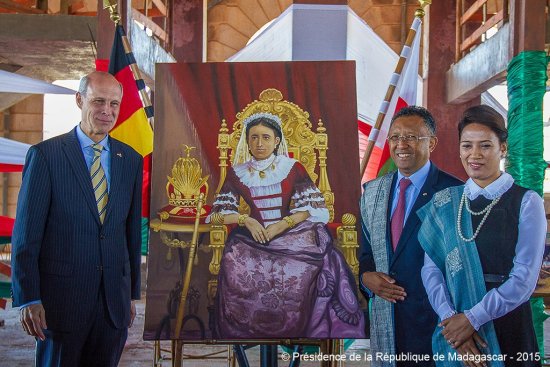 Pour le président malgache, la commémoration de ce triste anniversaire qui relève de la mémoire du pays en général, est un devoir de patriote. L’incendie qui a ravagé le Palais de Manjakamiadana, une demeure officielle des souverains de Madagascar au XIXe siècle, à Antananarivo et non moins symbole du patrimoine culturel de pays, avait pour but, en quelques sortes, de réduire en cendres l’histoire nationale. Mais, cela a, au contraire, engendré un grand intérêt envers son histoire pour le peuple malgache. C’est pourquoi l’État Malgache, à travers le Ministère de la Culture et de l’Artisanat, a décidé de procéder à la restauration des monuments historiques qui ont orné ce haut lieu de l’histoire et de la culture nationale, ainsi qu’à la valorisation des précieux objets de collection qui ont fait la fierté des Malgaches pour ce Palais. Seuls 20% environ ont été récupérés et conservés au Musée du Palais d’Andafiavaratra jusqu’à maintenant. Mais par chance, Mme Roth Gangen, a pu prendre des photos des tableaux lors des travaux de restauration au niveau du Palais de la Reine, en 1988. L’ambassade d’Allemagne à Madagascar a donc remis gracieusement ces 45 reproductions de tableaux, oeuvres d’art, représentant les portraits de nos illustres rois et reines des XVIIIe et XIXe siècles, des paysages d’Antananarivo au XVIIIe siècle, ainsi que des nobles personnalités d’antan.