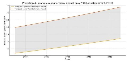 | Année | Hypothèse basse (1,5 Md USD/an) | Hypothèse haute (2,0 Md USD/an) |