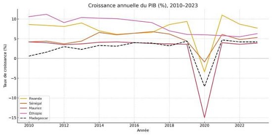 Entre 2010 et 2023, le Rwanda a affiché une croissance moyenne de 7,4 %, avec une baisse en 2020 (-3,4 %) suivie d’un fort rebond (+10,9 % en 2021), démontrant sa résilience institutionnelle.