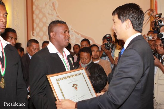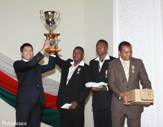 Oui, 60 millions d’ariary et le grade de chevalier national pour ces vaillants et valeureux sportifs en général issus du bas quartier, j’EN SUIS PERSONNELLEMENT RAVI ET HEUREUX POUR EUX ET POUR MON PAYS. C’est un geste de grande générosité et de reconnaissance de la part de SEM Andry Nirina Rajoelina. çà va faire des émules (positives !)dans d’autres sports !!Et je pense que son projet de créer un grand stade de rugby en est de véritables levier et stimulation.