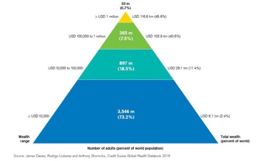 Selon le dernier rapport de Credit Suisse Research Institute sur la richesse des ménages, lorsqu’on y ajoute les 7,1% de personnes possédant des avoirs nets situés entre 100 000 $ et 1 million $, on arrive au constat, que 7,8% d’adultes dans le monde se partagent 86,2% de sa fortune totale, soit 220 500 milliards $.