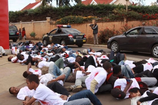 Mais le plus « ingénieux » ou le plus spectaculaire aura été ce parterre de jeunes gens, vêtus de tee-shirts blanc (distribués pour l’occasion) entachés de peinture pour figurer le sang et allongés pour donner l’impression de cadavres gisant sur le sol à l’entrée du site de l’hôtel Paon d’or Ivato.