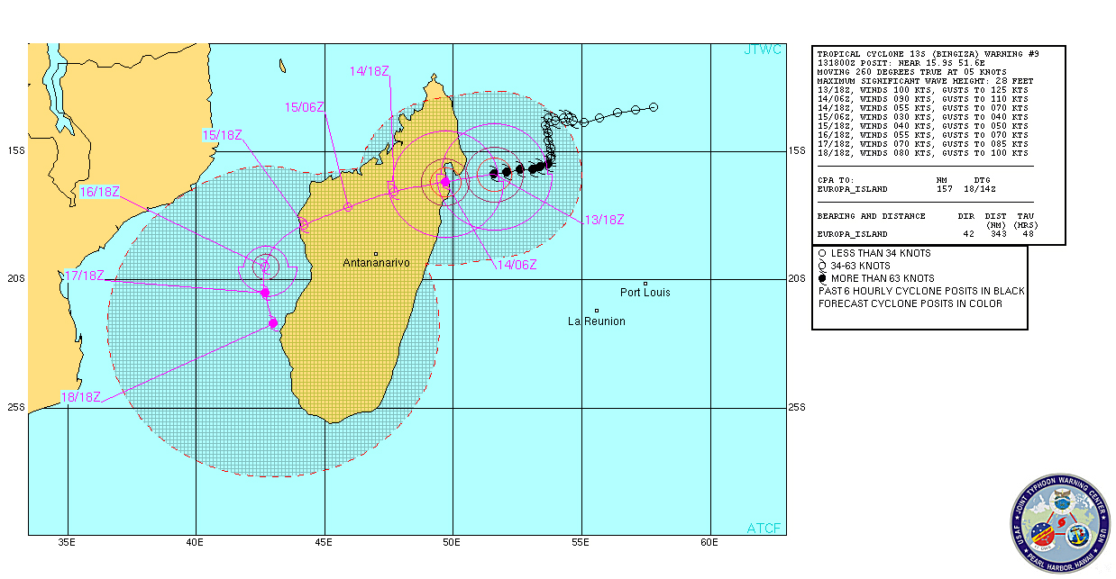 À 3 h du matin heure locale ce 14 février 2011, le cyclone tropical Bingiza se situait à 25 km à l’ouest du Cap Masoala, et se rapprochait à une vitesse de 18 km/h. Le vent moyen était à 157 km/h, avec des rafales à 222 km/h. L’impact devrait toucher principalement le Cap Masoala, la Baie d’Antongil et l’île Sainte Marie