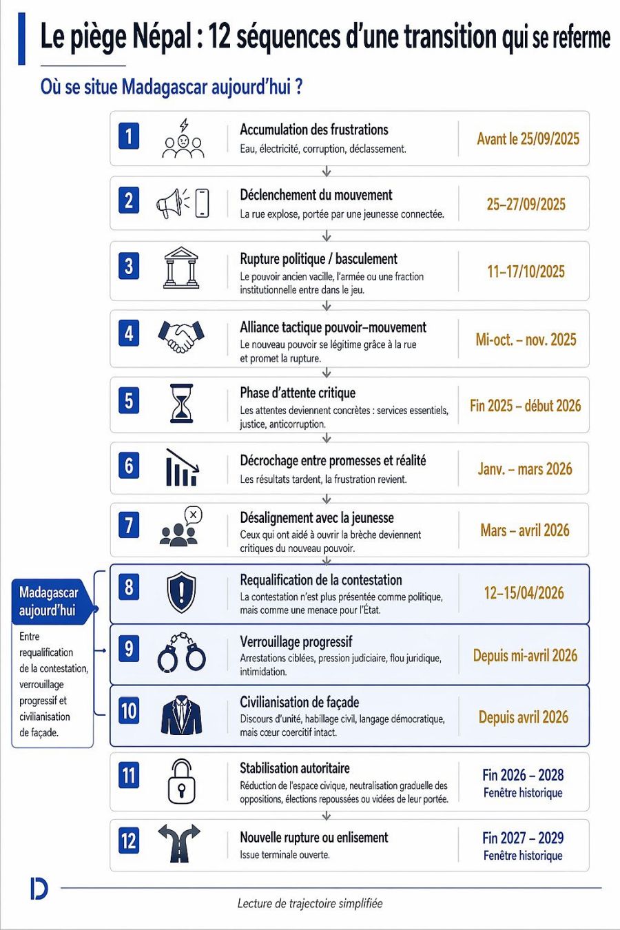 Cet article s’appuie d’abord sur deux références internes à Diapason : le dossier Le piège Népal [5], consacré aux mécaniques de captation des mouvements générationnels, et la note De la rupture promise à la sûreté de l’État [6], qui situe Madagascar entre requalification de la contestation, début du verrouillage et civilianisation de façade.