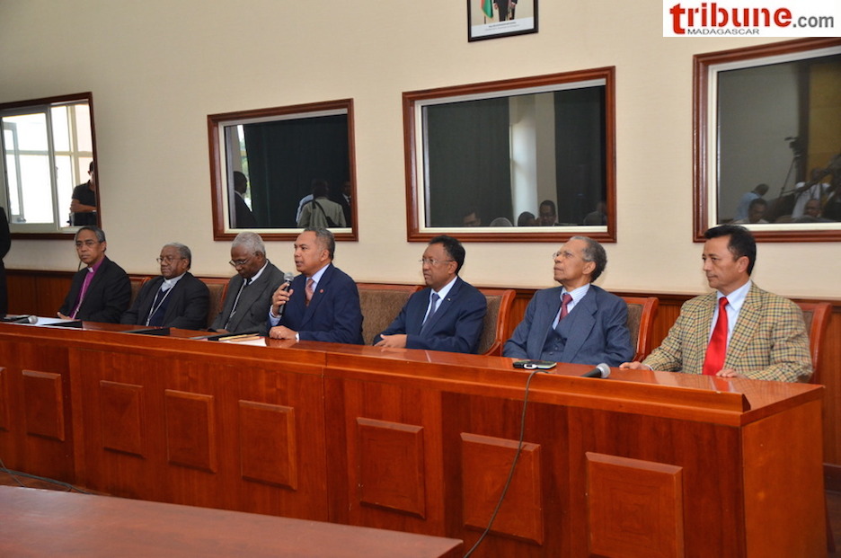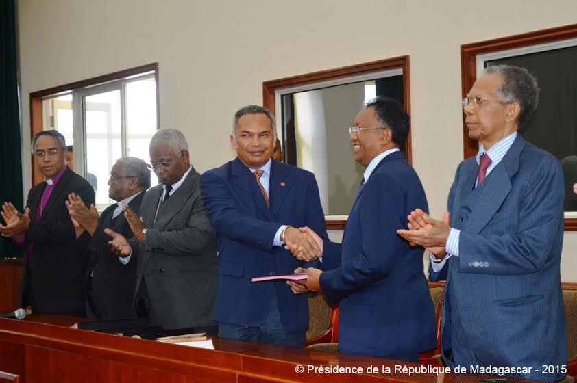 Après la présentation publique de la synthèse des résolutions prises lors de la dernière journée qui a clôturé samedi 2 mai, les assises nationales pour la Réconciliation, le président de la République, Hery Rajaonarimampianina, a reçu officiellement, ce 4 mai 2015, des mains du FFKM, les documents contenant l’intégralité des recommandations de la Conférence nationale qui s’est déroulée du 28 avril au 2 Mai 2015 au CCI Ivato.