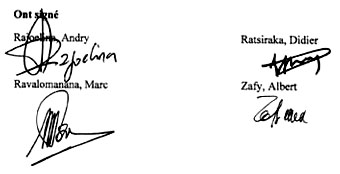 Les représentants de toutes les forces vives du Peuple Malgache (confessions religieuses, syndicats, forces armées et de sécurité, opérateurs économiques et organisations représentatives de la société civile) seront invités à adhérer a la présente Charte de la Transition.