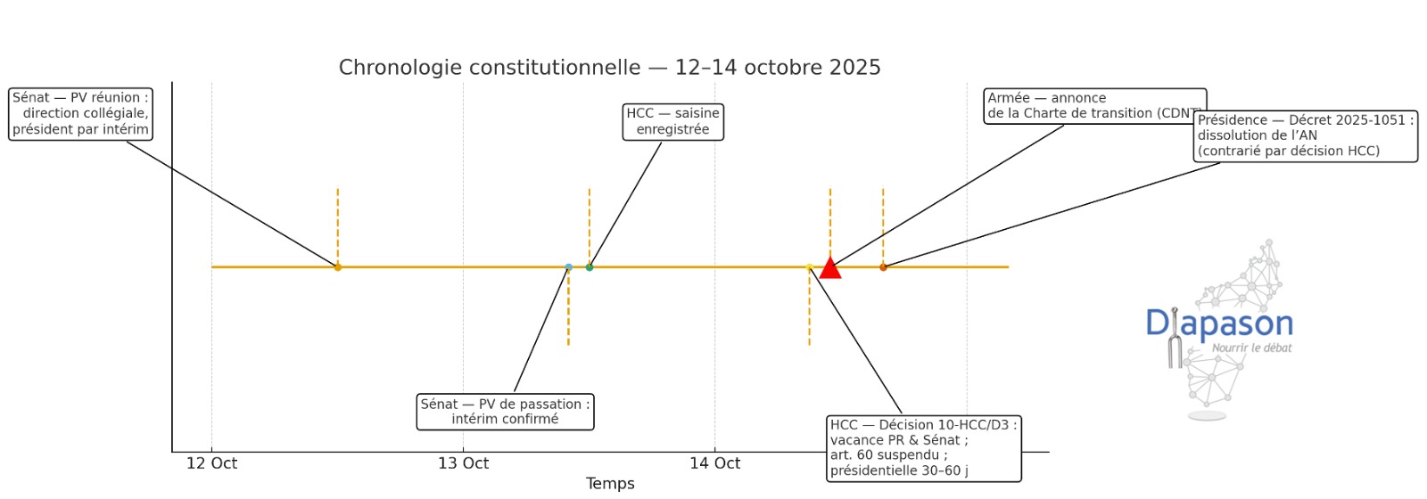 Entre le 12 et le 14 octobre 2025, Madagascar a traversé une séquence constitutionnelle d’une rare densité. En moins de soixante-douze heures, plusieurs actes majeurs se sont enchaînés : réunions du Sénat confirmant un intérim, saisine de la Haute Cour Constitutionnelle, annonce par l’armée d’une Charte de transition, tentative de dissolution de l’Assemblée nationale par décret présidentiel, puis décision de la HCC constatant la vacance du pouvoir présidentiel et encadrant la transition dans un délai de trente à soixante jours.