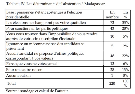Les tableaux « Niveau d’instruction des abstentionnistes », « Déterminants de l’abstention », « Intérêt et participation aux élections » sont tirés de « Abstention Electorale à Madagascar : Entre Deficit Civique et Defaillance de la Classe Politique » par Jean Angelson Randriamboavonjy (pdf disponible en ligne). Merci à l’auteur