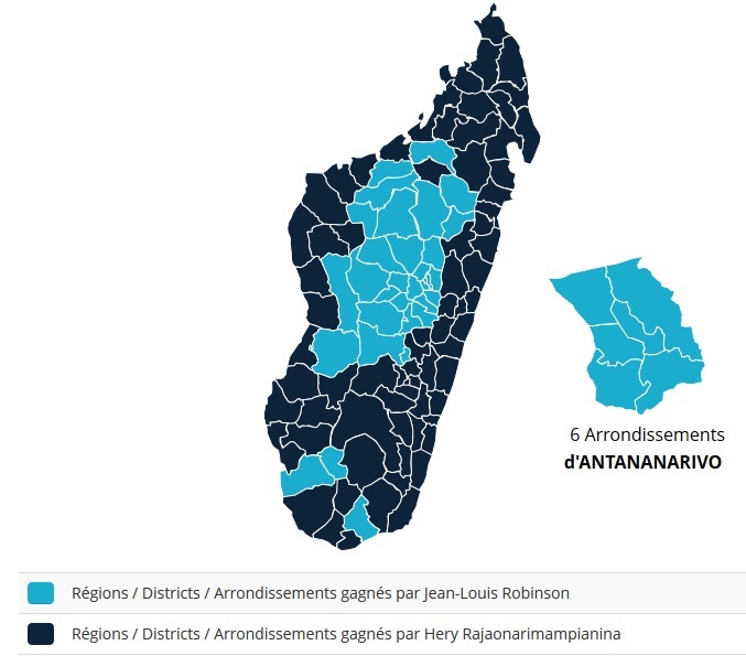 Enfin, comme le montre la carte ci-dessous produite par Madatsara [3], Hery Rajaonarimampianina est un merina essentiellement élu grâce aux électeurs des régions côtières, dans la mesure où les voix des électeurs dans les régions centrales ont été majoritairement pour son concurrent Jean-Louis Robinson. La bonne nouvelle est une image apparente d’unité nationale, en rupture avec ce que l’on pense traditionnellement au sujet de certains clivages. Toutefois, je me demande dans quelle mesure son assise est véritablement nationale, au regard du taux d’abstention dans les régions côtières.