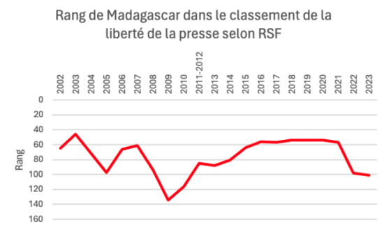 En matière d’application des valeurs démocratiques, Madagascar est donc dans une zone grise : ni tout à fait noire, ni tout à fait blanche. Plus particulièrement en matière de liberté de la presse, plutôt que de prêter attention aux discours de propagande des partisans ou détracteurs du régime, privilégions un indicateur qui fait autorité : le classement établi depuis 2002 par Reporters sans frontières (RSF) en matière de liberté de la presse.