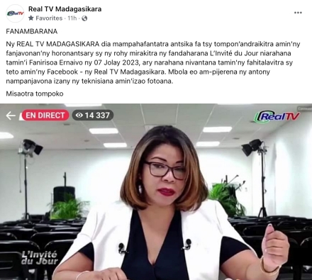 La chaine de télévision Real TV a annoncé la disparition sur sa page Facebook de l’archive de l’émission ayant eu pour invitée Fanirisoa Ernaivo. Au nom de la liberté d’expression garantie par la Constitution malgache, on ne peut qu’encourager tous ceux qui, comme elle le fait souvent, osent s’exprimer contre les dérives du pouvoir avec un argumentaire solide. Et on ne peut que féliciter Real TV pour le courage d’avoir invité cette personnalité dans le viseur du régime actuel. On rappelle avec amusement que celui-ci est pourtant né dans la lignée de la fermeture de Viva-TV, jugée « coupable » d’avoir accueilli une personnalité dans le viseur du régime d’alors en décembre 2008.