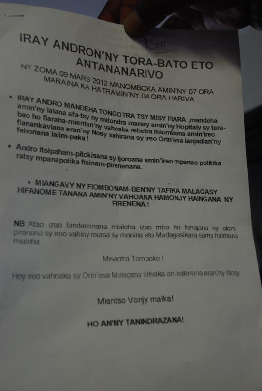 Une manifestation de contestation de la vie chère et de la pauvreté est prévue pour la journée du 9 mars 2012.Un tel tract pourrait être un "moyen tordu" pour faire capoter cette manifestation contre la vie chère et la pauvrté galopante à Madagascar.