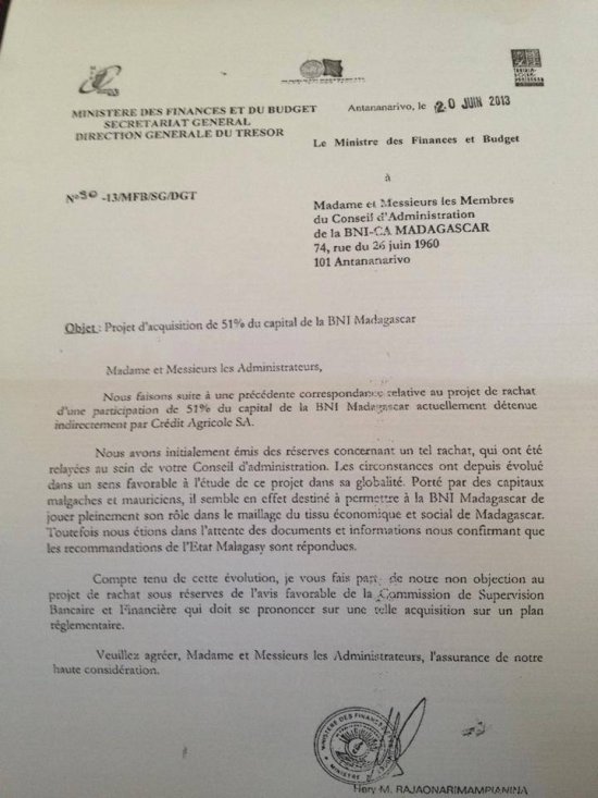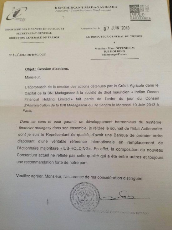 Le problème pour Andry Rajoelina est que les preuves de cette opposition ont déjà été révélées par les médias, et notamment par le présent site et par le site de la mouvance Ravalomanana. Pour la gouverne de nos gouvernants, voici donc le facsimilé d’une lettre du directeur général du Trésor marquant clairement son opposition à la cession projetée. Et si d’aventure Andry Rajoelina pensait que Hery Rajaonarimampianina ne serait jamais intervenu dans ce dossier, il n’aura qu’à lire cette lettre signée par le ministre lui-même.