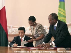 Cinq amendements et protocoles d’accord de la Communauté de la SADC ont été signés par le président de la République, Marc Ravalomanana, hier au Palais d’Etat d’Iavoloha. Les cinq amendements concernent le genre, le traité de la communauté, la science et la technologie, le commerce, et le tribunal de la SADC. La signature d’hier a été effectuée en présence du Secrétaire Exécutif Adjoint de la SADC, Joao Samuel Caholo, et vise à renforcer l’engagement de Madagascar au sein de l’organisation, notamment dans la Zone de Libre-Echange lancée officiellement en août dernier à Sandton, Afrique du Sud. L’objectif de la signature du protocole d’accord relatif au Genre et au Développement est, selon le Chef de l’Etat, d’accélérer l’intégration et la participation active des femmes dans le processus de développement de la région de la SADC.