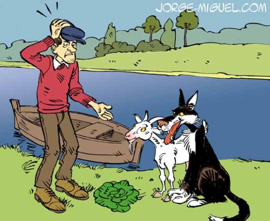 Un homme devait faire traverser une rivière à un loup, une chèvre et un chou dans une barque. Mais la barque est petite, et il ne peut embarquer qu’un des trois et lui-même à chaque traversée. Comment peut-il faire pour les faire traverser tous les trois sans laisser l’occasion au loup de manger la chèvre ou à la chèvre de manger le chou ?