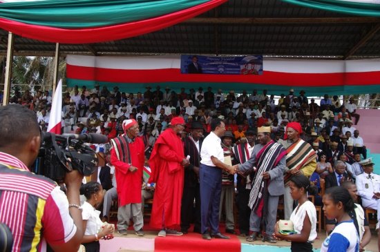 « Bénédiction et soutien inconditionnel des Ampanjaka aux efforts de développement », tel est le message de la Présidence de la République relatif à la visite du chef de l’Etat à Farafangana ce 4 janvier 2017. La campagne est lancée pour la course à la magistrature suprême. Après le parti politique HVM de la région Haute Matsiatra, c’est le groupe des Ampanjaka du « Grand Sud-Est », (« lonaka, olobe, ndrianony ») de réclamer officiellement et solennellement la candidature de Hery Rajaonarimampianina aux prochaines élections présidentielles. Les « Ampanjaka » vont soutenir cette candidature et faire sa propagande, sachant qu’ils sont les autorités admises et reconnues les premières autorités les plus proches des populations dans les zones enclavées et reculées du pays, précise un représentant des « Ampanjaka » hôtes de la cérémonie.