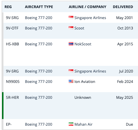 Ces cinq avions ont appartenu à diverses compagnies (Singapore Airlines, Scoot, NokScoot et Ion Aviation) avant d’être immatriculés à Madagascar, puis transférés à Mahan Air (voir photo pour le cas du 5R-HER). Ces avions seraient maintenant bel et bien arrivés en Iran.