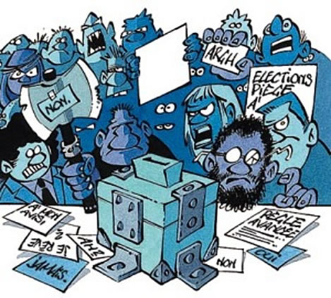 « D’autant que, invariablement, comme à chaque moment-charnière de l’histoire de Madagascar, la plus grande partie du personnel politique précédent se rallie au nouveau pouvoir. On l’a vu dans la constitution des différents partis à la tête du pays créés dans l’alignement au dirigeant élu, personnage symbolique « providentiel ». On l’a constaté pour le PSD, pour l’AREMA, le TIM, le HVM ou le TGV/IRD/MAPAR qui illustrent ces logiques d’alliances opportunes… « élections, piège à… » dit l’expression populaire. Ces élections, sous leur forme actuelle, ne changeront rien. La respectabilité, la légitimité après lesquelles courent les acteurs sont quand même bien compromises. »