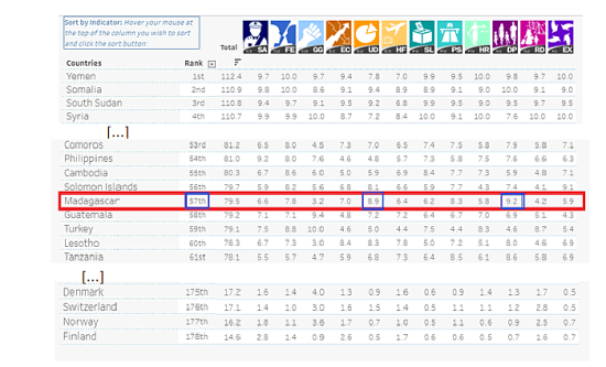 Effectivement, nous ne sommes pas noyés pas dans les fins fonds du classement des EtatsFragilesPasDitsFaillis .. Et pour cause : le pays n’est pas en guerre avec l’extérieur … Et l’insularité de Madagascar semble lui éviter la mauvaise note de ces territoires qui souffrent d’envahissements faute de pouvoir défendre leurs frontières. Le bas niveau de risque sur ces indicateurs sécuritaires ( ???) nous fait remonter dans le classement.