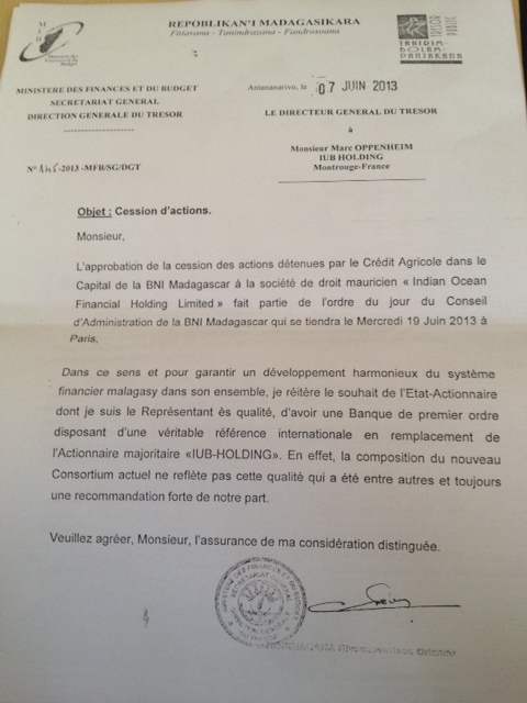 Dans le cas qui se présente, si quelques parties impliquées dans l’affaire ont observé une attitude changeante (voir doc photo 1 : lettre au conseil d’administration de la BNI en date du 20 juin 2013) sans que des faits pertinents nouveaux sont apparus, le directeur général du Trésor en tant que membre de la CSBF, a toujours parlé un seul langage (voir doc photo 2 : lettre en date du 7 juin 2013). La seconde réunion de la CSBF a décidé autrement en son absence. Mais cette seconde réunion a aussi été qualifiée par Serge Zafimahova de truffée d’irrégularités et de ne pas avoir rempli les conditions légales (voir mémo BNI Conseil d’Etat). Les preuves demandées par le président de la Transition sont déjà parues dans les médias.
