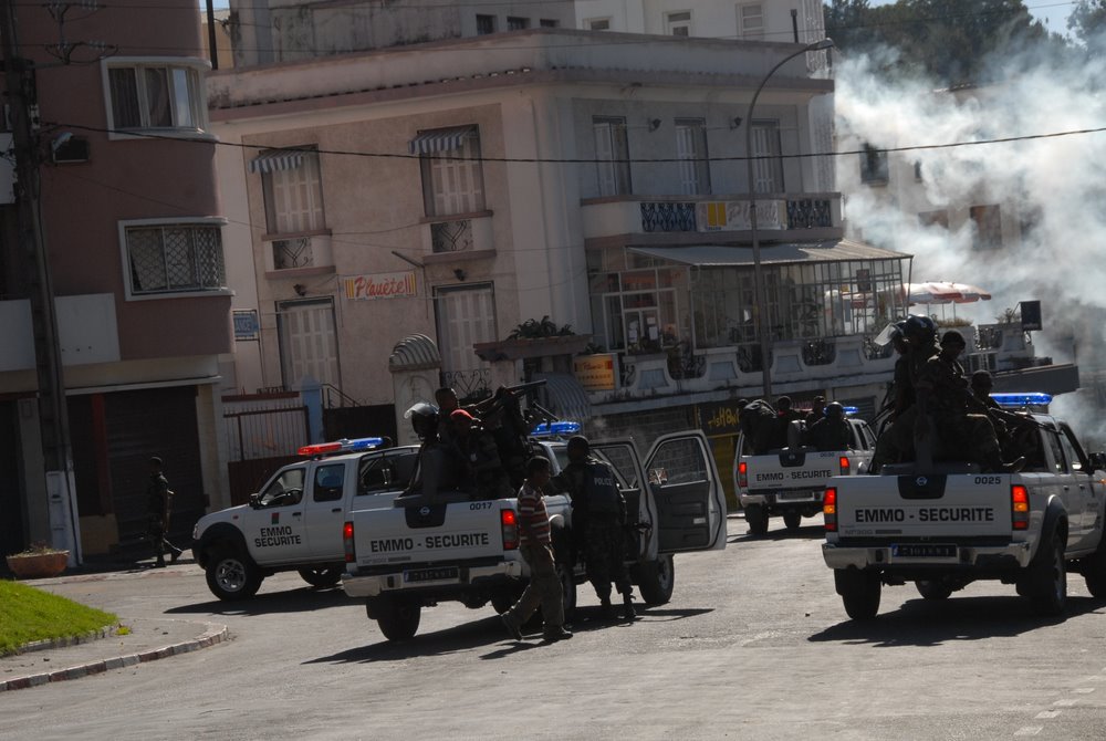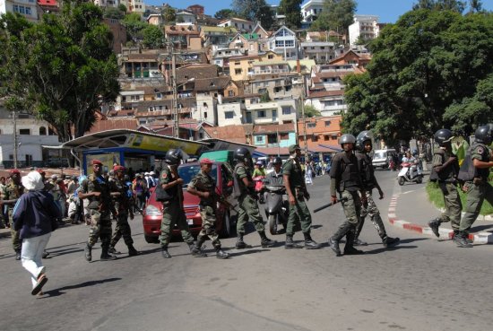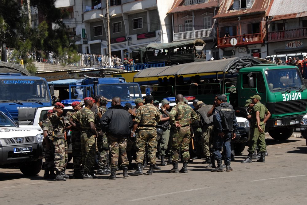 Dans le même temps, les forces de l’ordre déployaient petit à petit l’ensemble de leur dispositif : une dizaine de camions remplis de troupes anti-émeutes, des pick-ups patrouillant dans tout le centre-ville (y compris les nouveaux Nissan marqués « Emmo Sécurité » remis officiellement la veille par le Président de la Transition), et des patrouilles à pied tout autour du jardin d’Ambohijatovo.