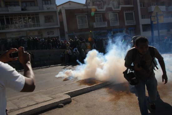 Presque simultanément, les jets de grenades lacrymogènes commençaient. Les forces de l’ordre tentaient de disperser la foule ; celle-ci reculait pour reformer de petits groupes un peu plus loin. Les véhicules pick-ups des forces de l’ordre poursuivaient les manifestants perçus comme étant plus agressifs.