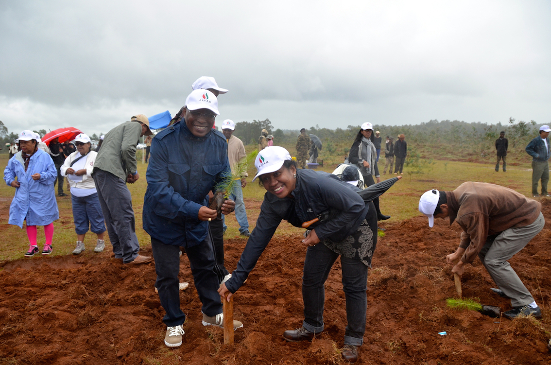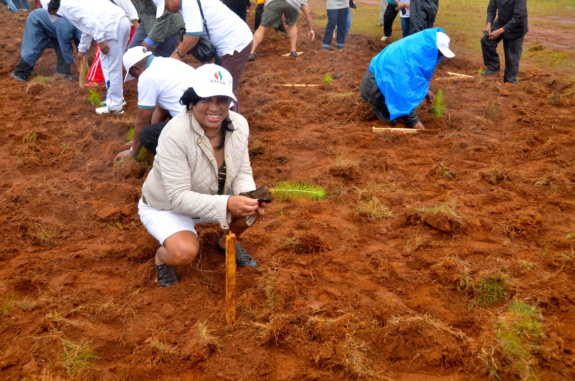 Conformément à la charte de l’Environnement et à la politique forestière à Madagascar, mais aussi mus par la conviction de la nécessité de reforestation et de la lutte contre les feux de brousse, les compagnies pétrolières regroupées dans l’Association Professionnelle des Pétroliers Amont de Madagascar (APPAM) présidée par Madame Marcelle Dané, ont consacré la journée du mercredi 11 février 2015 à une opération de reboisement. Les membres de l’APPAM accompagnés par des représentants des entités partenaires, tel le DG de l’OMNIS, Bonaventure Rasoanaivo, et l’EITI par son Secrétaire exécutif, Daniella Randriafeno, ont été plantés des jeunes sapins sur une partie du Domaine forestier national sis à Masoandro, commune rurale d’Ampitatafika, région Vakinankaratra, sur la RN7.