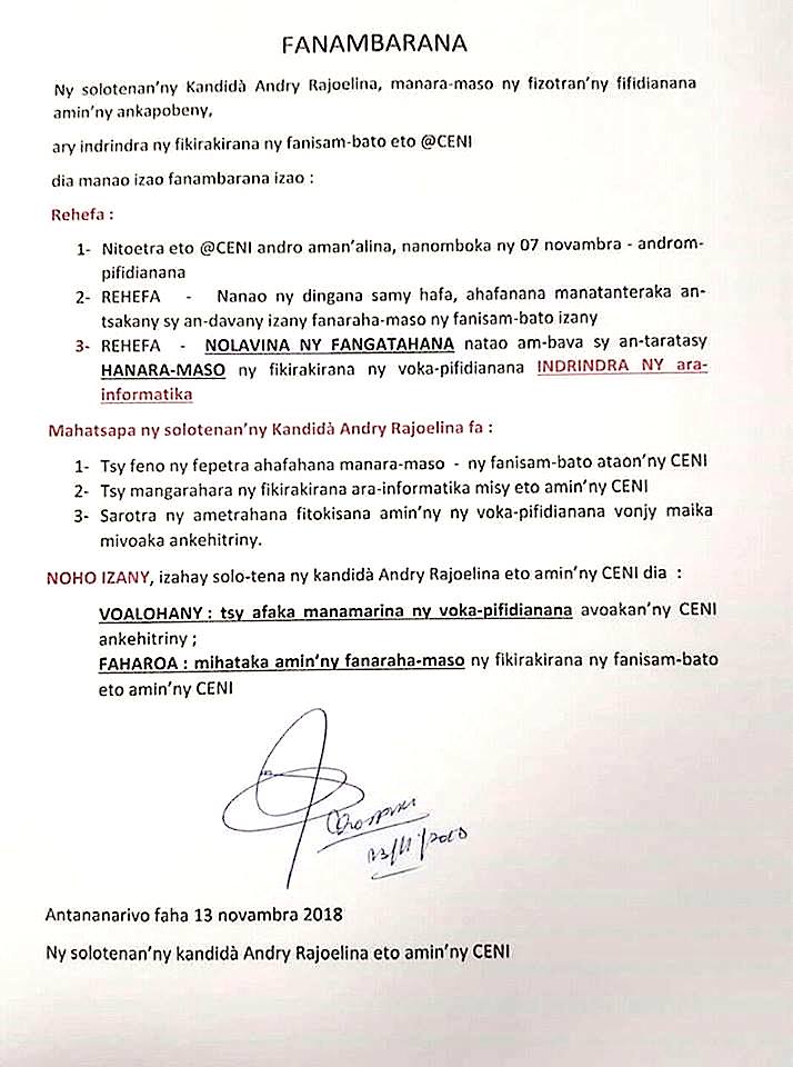Ce mardi 13 novembre, les représentants du candidat N°13 Andry Rajoelina -la coïncidence est frappante- ont quitté le bureau de la Commission Nationale Electorale Indépendante (CENI) à Alarobia. Ils vont cesser de suivre et d’assister au traitement des résultats du scrutin du 7 novembre faute de transparence sur la méthode d’organisation de la CENI selon eux. Ils déplorent, entre autres, l’impossibilité d’accéder et de contrôler le traitement informatique des résultats à Alarobia.