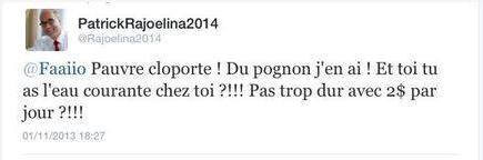 Il avait commencé par se faire remarquer en publiant un tweet (par la suite effacé ), dans lequel il traitait un internaute malgache de « Pauvre cloporte », en étalant l’argent qu’il a en tant que fonctionnaire français, et en se moquant des 92% de Malgaches qui vivent avec moins de 2 dollars par jour. Quel scandale ! Qui est-il pour oser se moquer de ceux qui n’ont pas eu besoin d’émigrer comme nous (lui compris) pour gagner leur pain à la sueur de leur front ? Ce tweet méprisant envers la majorité des malgaches montre une mentalité de parvenu qui fait honte à la diaspora.