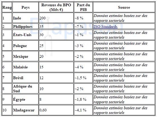 Les données concernant le classement des pays leaders dans le secteur de l’externalisation des processus métier (BPO) en 2023, notamment les revenus en milliards d’euros et leur part dans le PIB, proviennent de diverses sources. Voici le détail des informations disponibles :