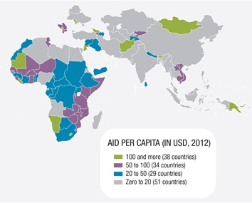 Madagascar fait partie des 51 pays considérés par l’OCDE comme « orphelins de l’aide », autrement dit, un pays qui ne bénéficie pas du volume d’aide suffisant malgré les énormes besoins (voir figure). En 2012 Madagascar faisait partie des pays qui recevaient entre 0 et 20 dollars d’aide par tête. La stabilité politique peut être une explication à cette situation, mais elle doit être nuancée quand on s’aperçoit qu’un pays comme la Mauritanie en recevait au moins 100 en 2012. Nous avons donc une incapacité d’attraction, ou une capacité de répulsion, dont il faudrait un jour déterminer les causes. Effectivement, pourquoi un investisseur étranger irait-il investir dans un pays tel que le nôtre [4] ? D’un autre côté, les bailleurs de fonds « traditionnels » risquent d’être de plus en plus échaudés par ces crises cycliques et la corruption irréversible, et pourraient légitimement préfèrer accorder plus d’aide à des pays « plus méritants » ou « plus sérieux », car à Madagascar, non seulement cette aide se révèle inefficace comme un éternel tonneau des Danaïdes, vue la décrépitude continue de la situation, mais en plus la xénophobie latente des Malgaches tend à faire des étrangers les boucs émissaires systématiques de leurs propres turpitudes.