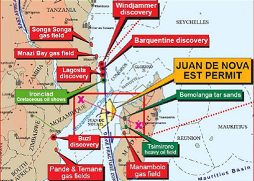 La délimitation de ces ZEE a des implications économiques évidentes, en premier lieu en ce qui concerne la pêche. Ainsi, la secrétaire d’Etat soulignait dans son allocution du 5 octobre 2009 que « les richesses de l’océan dont nous avons la responsabilité au travers de nos ZEE doivent profiter davantage à l’ensemble de la France de l’océan Indien ». Mais depuis quelques années, des intérêts bien plus grands se profilent et génèrent une urgente nécessité de régler définitivement la question de souveraineté et de ZEE sur toute la zone du Canal du Mozambique. Déjà en 2003, une étude réalisée par TGS-Nopec, société d’exploration pétrolière, prédisait que « le Canal du Mozambique peut être comparé à la Mer du Nord dans le milieu des années soixante, lorsque la découverte d’un important gisement gazier en révéla les potentialités » [11]. Ce premier gisement a été découvert dans les eaux territoriales du Mozambique. Selon TGS-Nopec, les deux gisements de pétrole découverts à Madagascar plaident aussi pour une région riche en hydrocarbure. On shore et off shore, l’exploration pétrolière et gazière couvre d’ailleurs un bon tiers du territoire malgache. Autour de Juan de Nova, la France a cédé deux permis d’exploration pétrolière, lesquels sont d’ailleurs entachés d’illégalité dans la mesure où ces permis portent sur une zone dont la frontière avec Madagascar « reste à déterminer », et… juxtaposent des permis accordés par l’Etat Malgache [12]. Au Mozambique, outre le gisement gazier qui pourrait propulser l’un des pays les plus pauvres au monde au rang de pays émergent, d’autres programmes d’exploration pétrolière et gazière pourraient s’avérer positifs. Un projet de raffinerie y est en passe de voir le jour pour un investissement de plus de 6 milliards de dollars [13]. Tout récemment, les Comores viennent de signer un accord de coopération avec une compagnie pétrolière portant sur l’exploration dans toutes leurs eaux territoriales [14]. Madagascar et le Mozambique étaient d’ailleurs cités dans une conférence mondiale sur le pétrole organisée à Paris par IFP Énergies nouvelles et Pétrostratégies en mai dernier, où était invité le Ministre de l’Energie de Madagascar [15]. Assez curieusement, le rapport du Sénat français [16] ne parle pas de ce potentiel ; pire, il suggère en annexe qu’il n’y aurait aucun intérêt pétrolier attaché aux îles Éparses. On peut se demander comment la mission sénatoriale et les experts consultés ont pu faire l’impasse sur ces importants travaux d’exploration et découvertes.