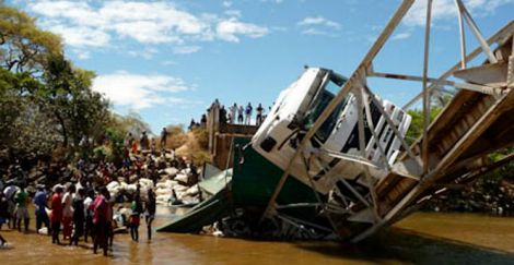 Les relations privilégiées (sous plusieurs régimes, depuis Zafy jusqu’à maintenant) entre certains gros transporteurs et les dirigeants n’ont-il pas un lien avec les difficultés d’application des normes de charge à l’essieu et de tonnage autorisé sur les ponts ? [4] Cela a détérioré bien des kilomètres de routes avant l’heure, et a eu des conséquences dramatiques sur certains ouvrages, comme celui de Marivorahona en août 2012 (crédit photo : La Tribune de Diégo).