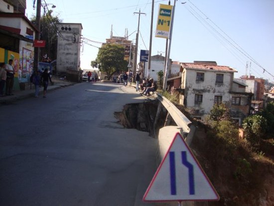 Il faut reconnaître que cette situation est le legs de décennies de mauvais choix, d’inaction et de gabegie, et il serait donc non-objectif de mettre la situation actuelle sur le dos du Président de la transition (PT) Andry Rajoelina. Par contre, il est indéniable que le coup d’État du PT a soufflé comme un vent mauvais sur les projets routiers soutenus par les grands bailleurs de fonds, à commencer par l’Union européenne. Mais de toutes manières, comment la clique hâtive, qui n’est même pas fichue de faire réparer un trou de 17 mètres de hauteur qui bée depuis plus d’un an en plein milieu de la Capitale à Ambanidia (source photo : Facebook), pourrait-elle se préoccuper de la RN13 à des milliers de kilomètres de ses yeux ?