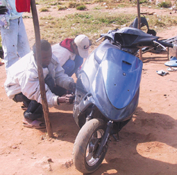 Quelques minutes d’inattention de la part du propriétaire peut lui coûter la perte de sa moto. Les voleurs sont armés de trousseaux de clefs qu’il n’est pour eux qu’une question de temps pour débloquer le guidon et ensuite démarrer la moto. Le coup du tournevis est fréquent. Dans le cas où le boîtier de contact est déjà défectueux, il suffit pour le voleur de le forcer d’un grand coup de tournevis plat pour s’accaparer du bien d’autrui. Si la moto est attachée par une chaîne, les malfaiteurs n’hésitent pas à la couper au moyen d’une pince-monseigneur, un outil capable de casser les aciers en y exerçant des pressions de quelques tonnes par ses pinces tranchantes. Les voleurs utilisent cette méthode dans les endroits isolés et pendant leurs opérations nocturnes. Quelquefois, les chaînes sont broyées et les motos embarquées dans des camionnettes. Dans cette perspective, les larrons disposent d’ateliers où ils transforment les motos. À entendre les mécaniciens, bien souvent, les propriétaires ne verrouillent pas leurs guidons que les voleurs peuvent dérober leurs motos en deux temps trois mouvements.