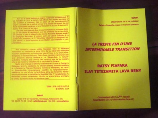 « La triste fin d’une interminable transition » ; tel est le titre du 12è recueil des communiqués de l’Observatoire de la vie publique (SEFAFI), rendu public ce jeudi 17 avril au Centre de presse malagasy à Antsakaviro. Le moment d’entre deux événements –la prise de service du nouveau Premier ministre, Roger Kolo, et la publication des membres du gouvernement–, a été pour la presse et les membres de la SEFAFI, l’occasion d’évoquer aussi bien l’actualité brûlante que le fond des problèmes auxquels le pays est confronté. L’enseignement supérieur et l’éducation qui sont les leviers et bases du développement de l’avenir de la nation sont toujours en difficultés ; les élections et les textes de loi sont tels qu’ils ont engendré des problèmes au sein de l’Assemblée nationale, et la crise politique sont encore autant de problèmes et défis à surmonter.