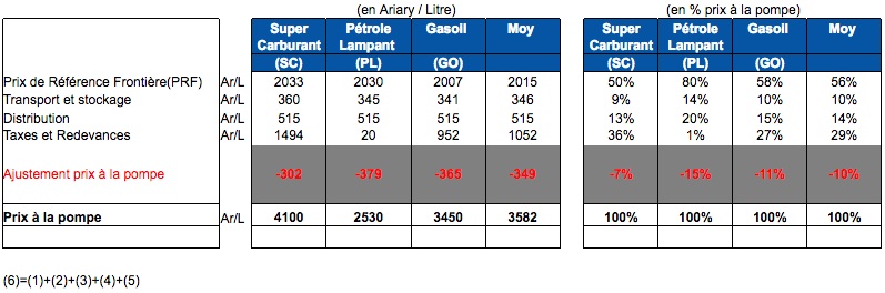 La vérité des prix était prévu être atteinte en octobre 2018 selon les informations sur le site le l’Office Malgache des Hydrocarbures mais au mois d’août, les prix sont encore situés à -440Ar/L en dessous de cette vérité des prix. Le prix actuel du super carburant est de 4150 Ar/L et le gazoil de 3500Ar/L.