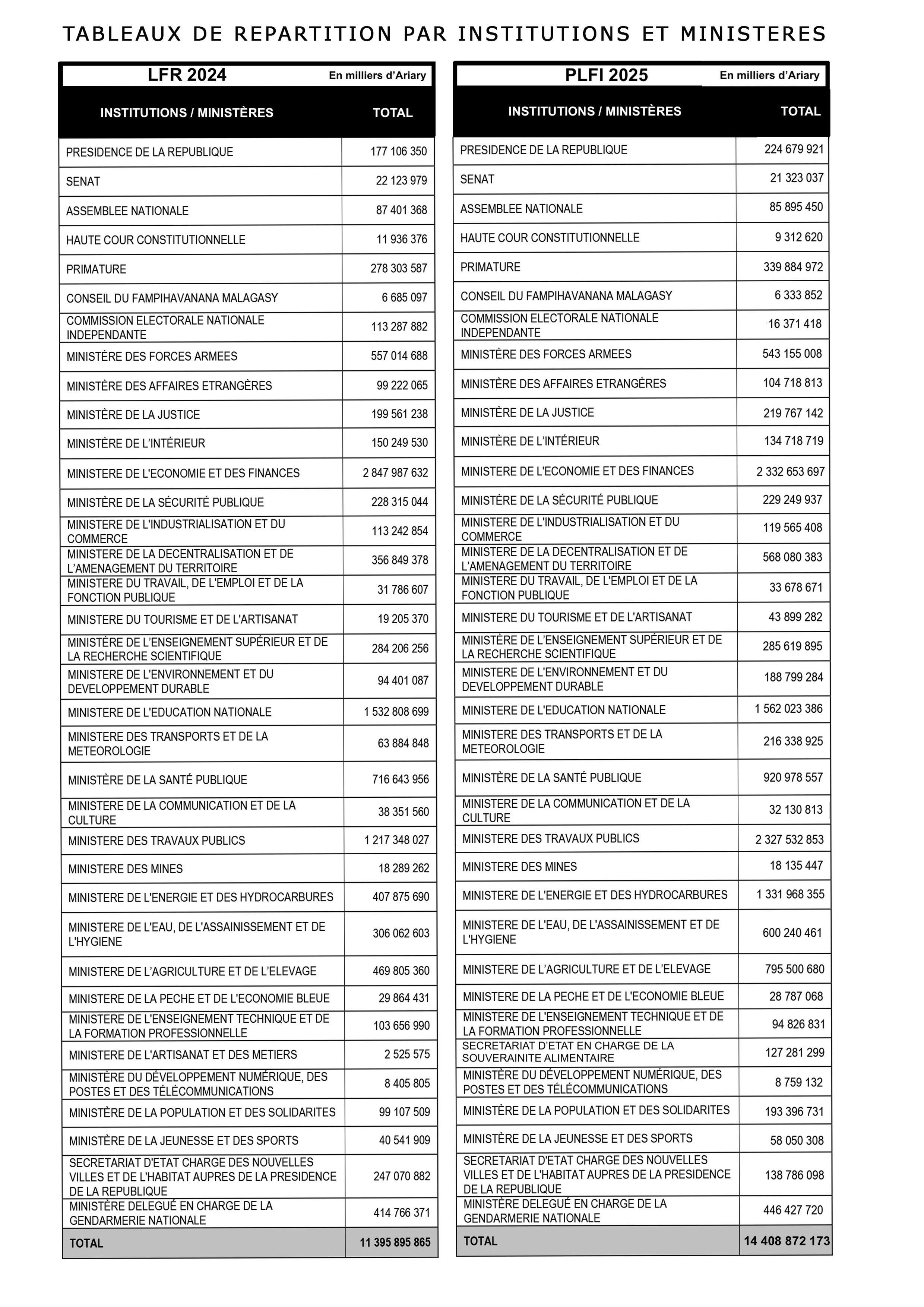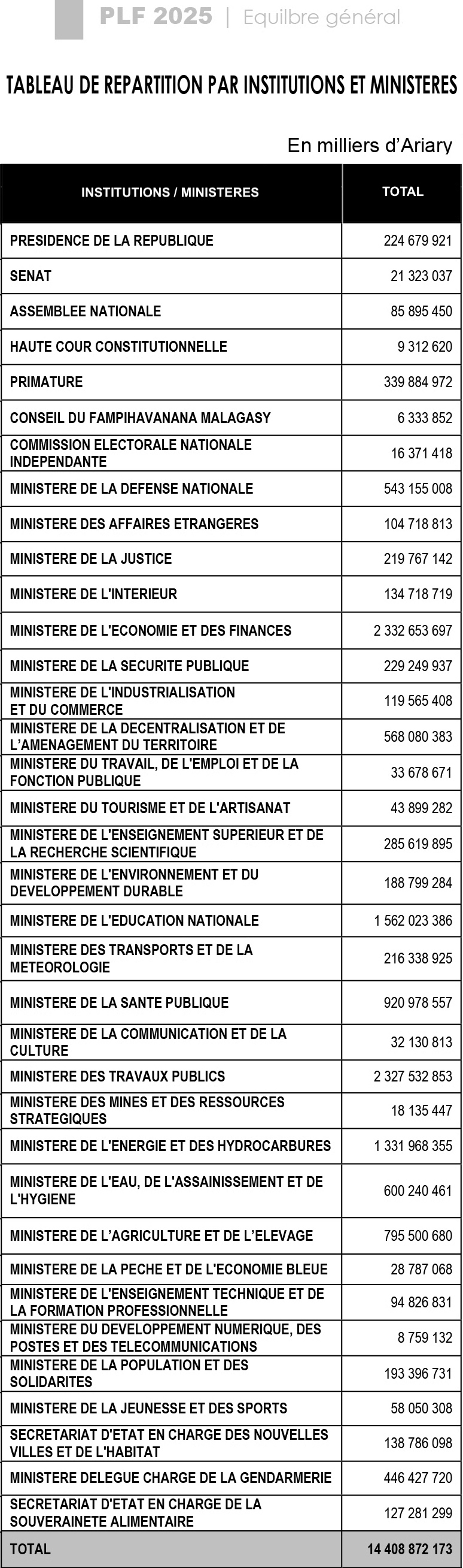 Un budget total de 14 408 872 173 000 d’ariary seront alloués aux pouvoirs publics et ministères en 2025, d’après ce qu’il est mentionné dans le projet de loi de Finances, élaboré par le ministère de l’Economie et des Finances. Ceci présente une hausse de plus de 4 000 milliards d’ariary par rapport au budget inscrit en 2024, dans le cadre de la loi de Finances rectificative. Visiblement, une hausse assez importante est également constatée dans le budget de certains ministères et institutions de la République, contrairement à ce qu’il a été dit, quelques semaines plus tôt par le président de la République, concernant l’effort commun » pour sauver le secteur énergie.