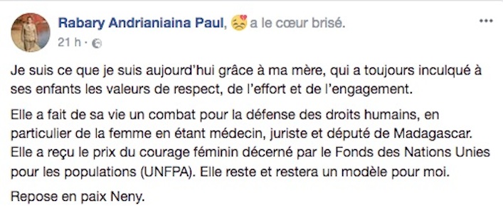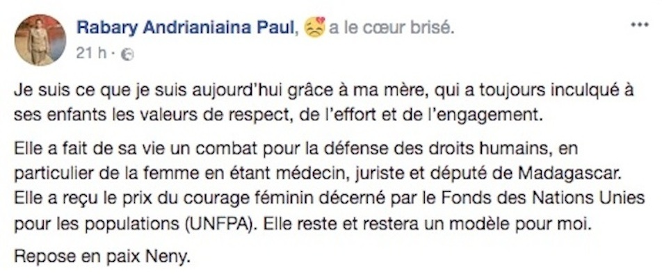 Femme engagée dans la protection des Droits de la femme, députée de l’UNDD puis de l’AVI, membre du groupe des sages « Ray amandreny mijoro », Mathilde Rabary s’est éteinte ce 30 octobre 2017 à l’âge de 73 ans. Médecin de formation et juriste, Mathilde Rabary était sur tous les fronts au niveau social et politique. Son fils, Paul Rabary, actuel ministre de l’Education nationale qui lui a emboité le pas en politique, a rendu un dernier hommage à sa mère hier par une publication sur sa page Facebook.