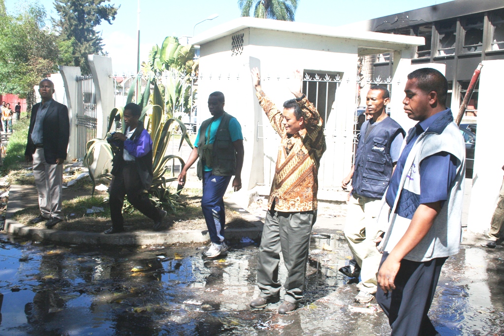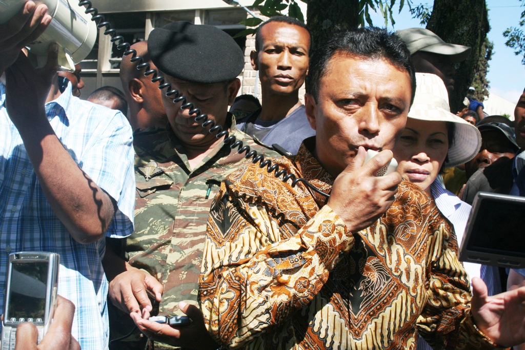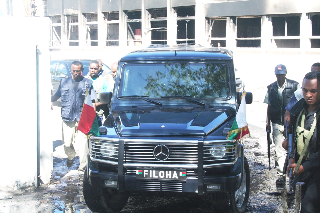 Début de la contre-offensive médiatique du Président Ravalomanana le mercredi 28 janvier : visite des studios de la Radio et de la Télévision nationales détruits l’avant-veille par des pillages.